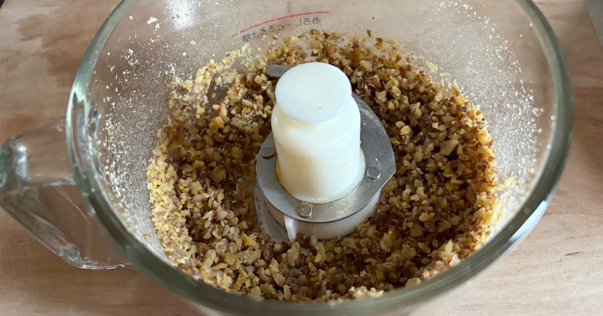 甘栗をフードプロセッサーで粗めに砕き、ラム酒を加えて全体をそぼろ状にする。