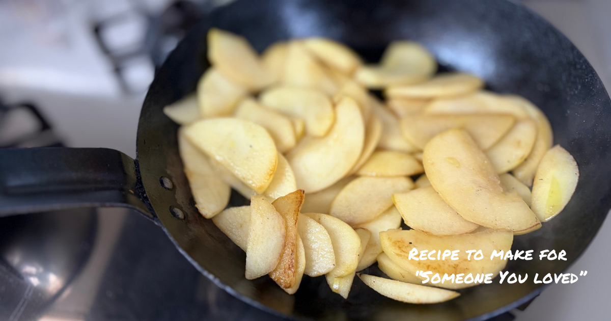 Wash the apples well, remove the stem and peel, cut in half, then slice thinly (as shown in the photo).If you used salted water, pat them dry with paper towels before cooking.