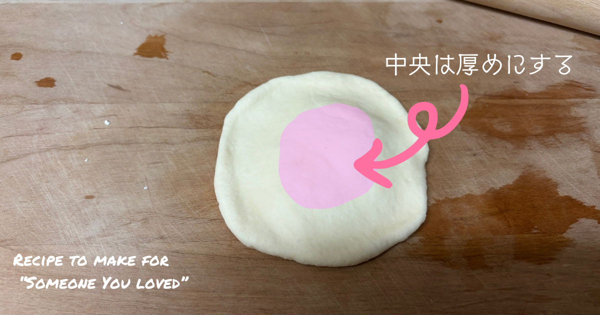 2. 麺棒で中央を厚めに、外側を薄く丸く伸ばす(直径10cmくらい)。